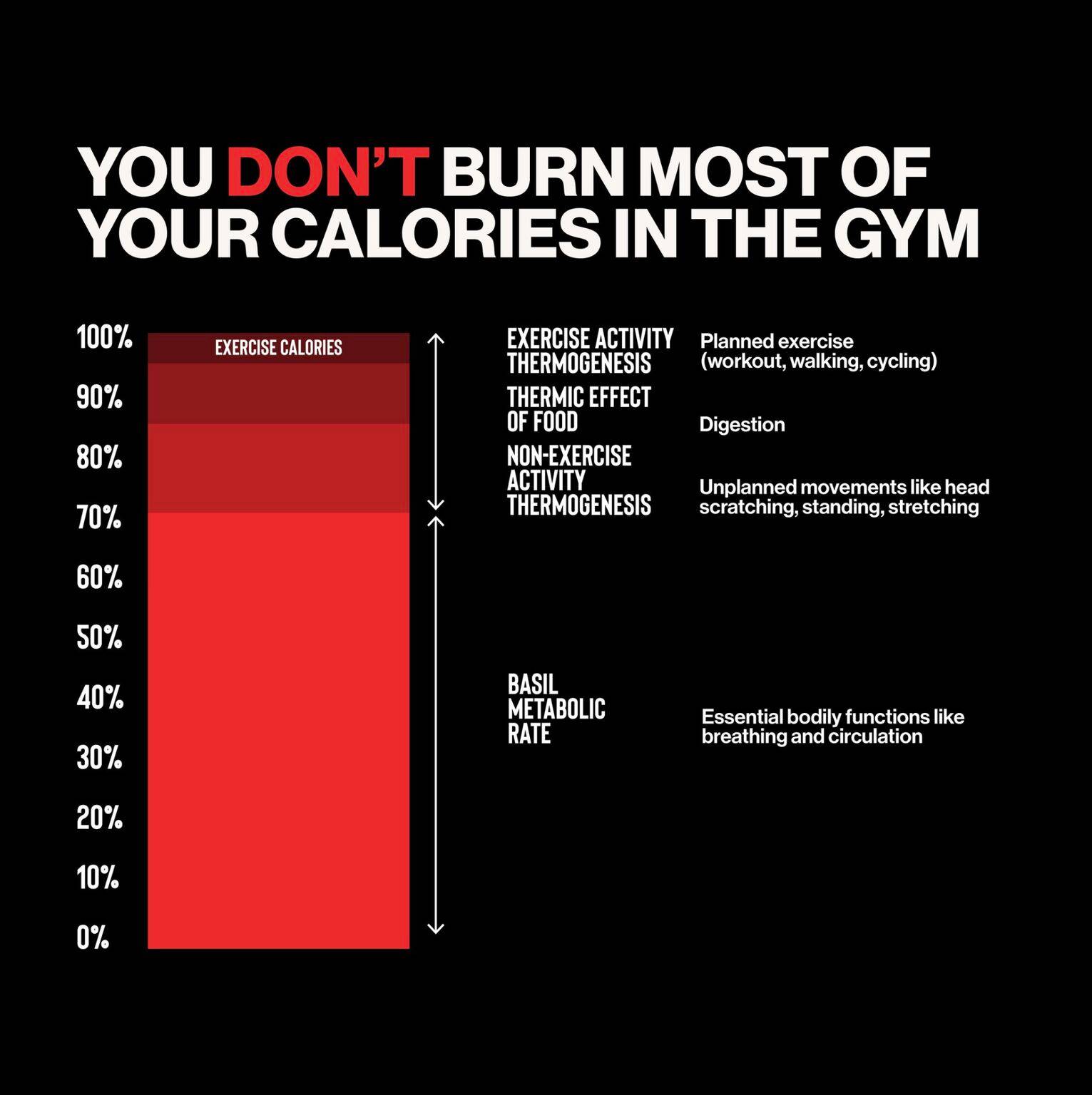 Basal Metabolic Rate (BMR): 70% – The calories needed to keep you alive, even if you’re lying in bed.